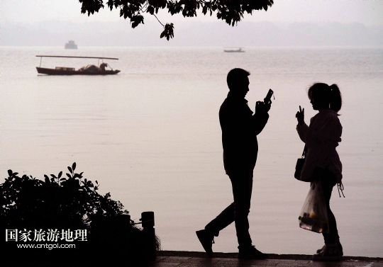 國(guó)家旅游地理 浙江杭州11月5日訊 11月4日,一對(duì)男女青年在西湖邊拍照留影。生活在杭州的人是幸福的,因?yàn)楹贾萦形骱?。清晨的西湖,恬靜,淡雅,柔美,朦朧。岸邊,堤上,健身鍛煉的市民、散步賞景的游人,在湖水、小橋、亭閣、石欄的襯伴下,構(gòu)成了一幅幅剪影效果的水墨圖畫。 /新華社記者王頌攝