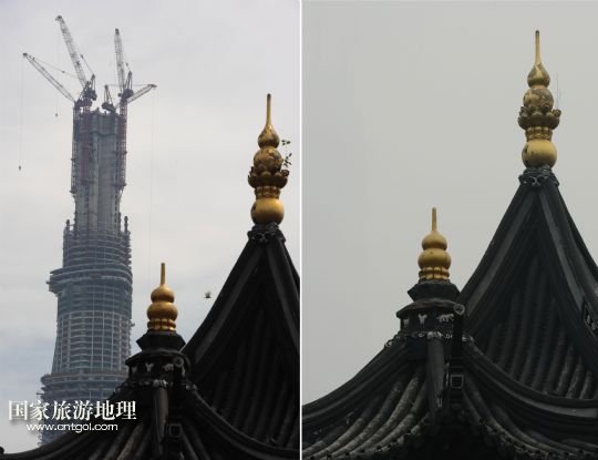 國(guó)家旅游地理 上海12月26日訊 這張拼版照片顯示的是:2013年8月3日在上海豫園拍攝的在建中的上海中心(左圖);12月26日在同一地點(diǎn)拍攝的上海中心“消失”在霧霾中(右圖)。當(dāng)日,上海遭遇霧霾天氣,空氣重度污染。 /新華社發(fā)(賴鑫琳 攝)