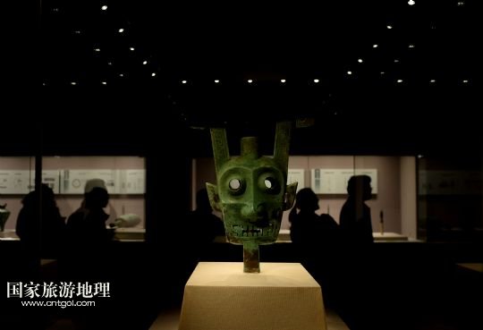 3月1日,人們?cè)诮魑奈锞氛股蠀⒂^(guān)雙面神人青銅頭像。