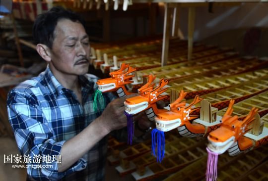 國家旅游地理 湖北宜昌5月15人訊 5月15日,手工藝人鄭祥龍?jiān)跒槲⑿妄堉凵淆堫^。端午節(jié)臨近,屈原故里湖北省秭歸縣歸州鎮(zhèn)手工藝人鄭祥龍精心制作一條條微型木制龍舟,準(zhǔn)備在端午文化節(jié)期間向中外游客進(jìn)行展示。