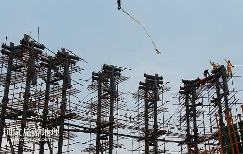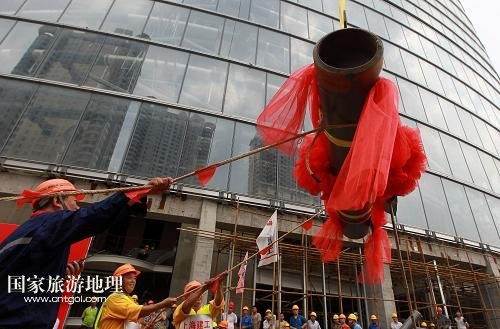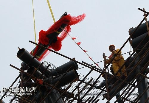 國(guó)家旅游地理 上海8月3日訊 8月3日,上海機(jī)械施工集團(tuán)公司的工程人員指揮最后一榀桁架的吊裝。當(dāng)日上午,隨著塔冠結(jié)構(gòu)中最后一榀鰭狀桁架緩緩起吊并安裝到位,歷時(shí)近6年建設(shè)的“上海中心”按計(jì)劃順利達(dá)到設(shè)計(jì)高度632米,刷新了“申城之巔”的新紀(jì)錄。據(jù)介紹,“上海中心”2014年年底將實(shí)現(xiàn)除酒店精裝修部分外的土建竣工,2015年年中將投入運(yùn)營(yíng)。新華社記者 裴鑫 攝