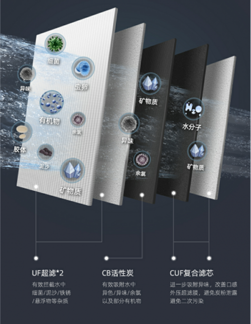 除去主濾芯,另外兩個副濾芯分別是CB活性炭濾芯和CUF活性炭超濾膜復(fù)合濾芯。其中,CB活性炭濾芯吸附水中余氯、異色異味、有機物,改善飲水口感,讓自來水變得更加甘甜鮮活,口感甚佳;而CUF活性炭超濾膜復(fù)合濾芯則能進一步吸附水中的余氯等異色異味,提升飲水口感,并防止碳粉泄露和微生物侵入,避免水質(zhì)二次污染。